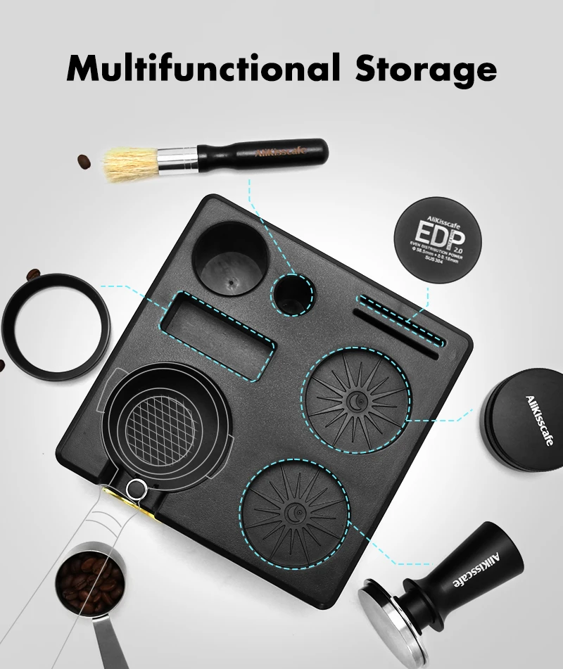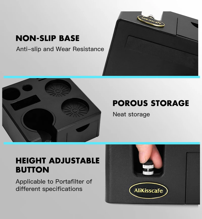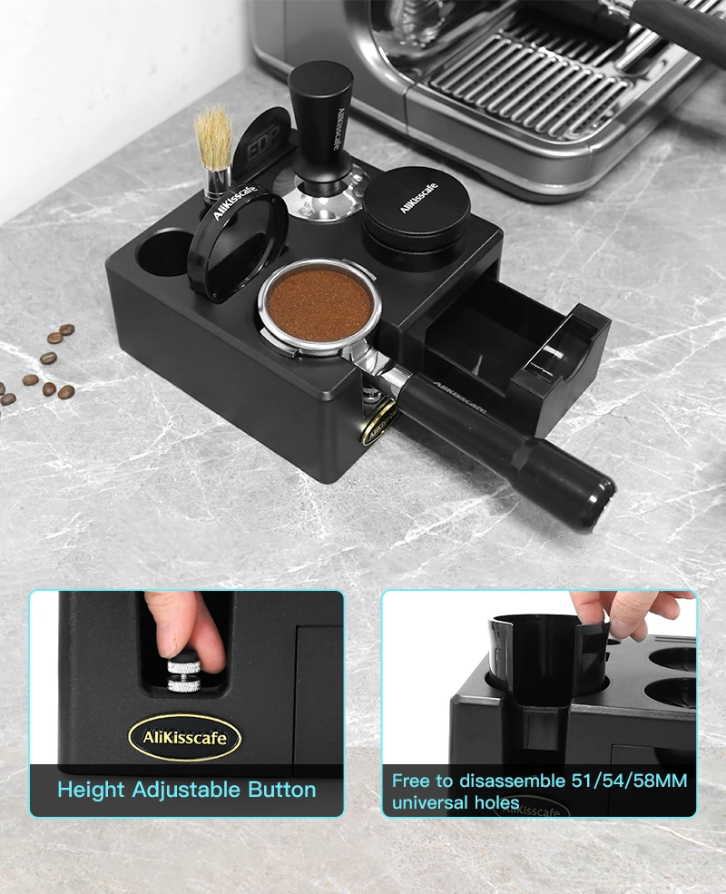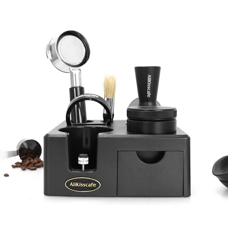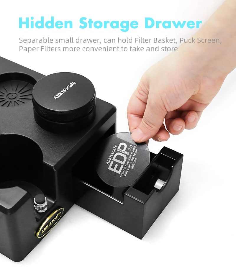 Premium Coffee Tamping Station with Drawer – Stable, organized, and compatible with all major espresso portafilters. Perfect for home or professional baristas. This station keeps your workflow efficient, your countertop tidy, and your espresso consistently excellent—bringing a professional coffee experience into your kitchen.