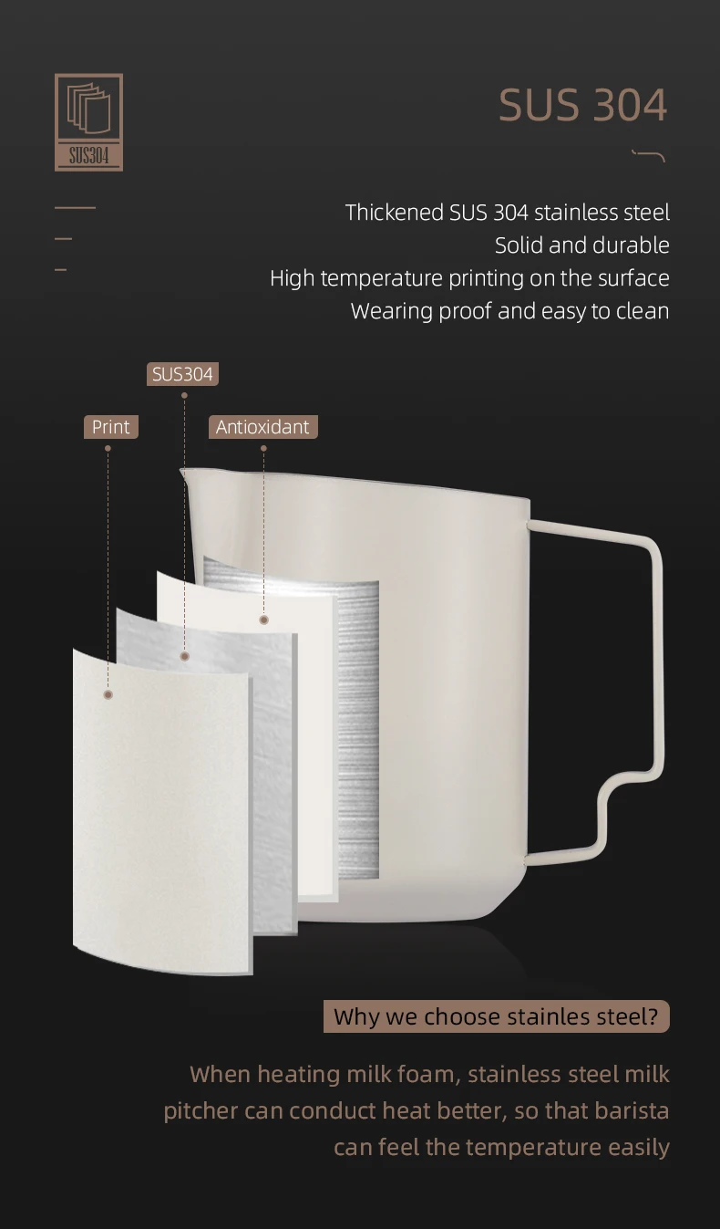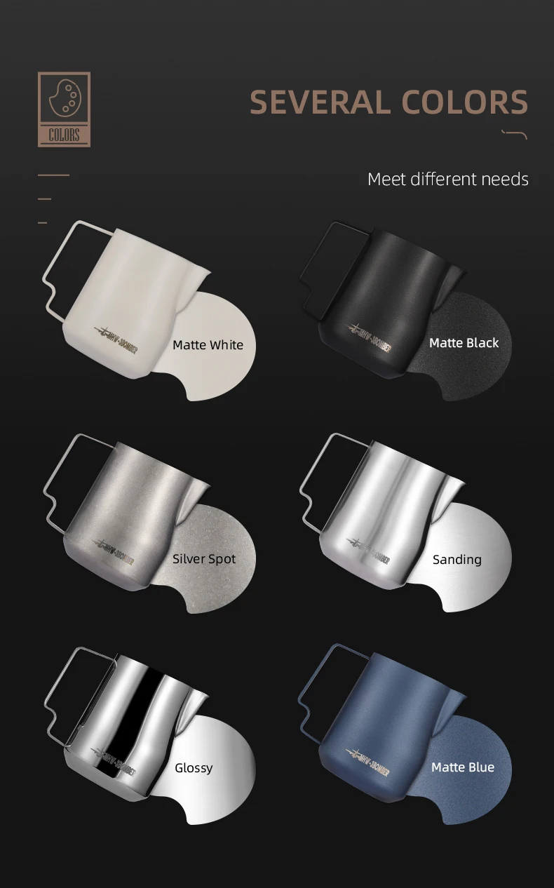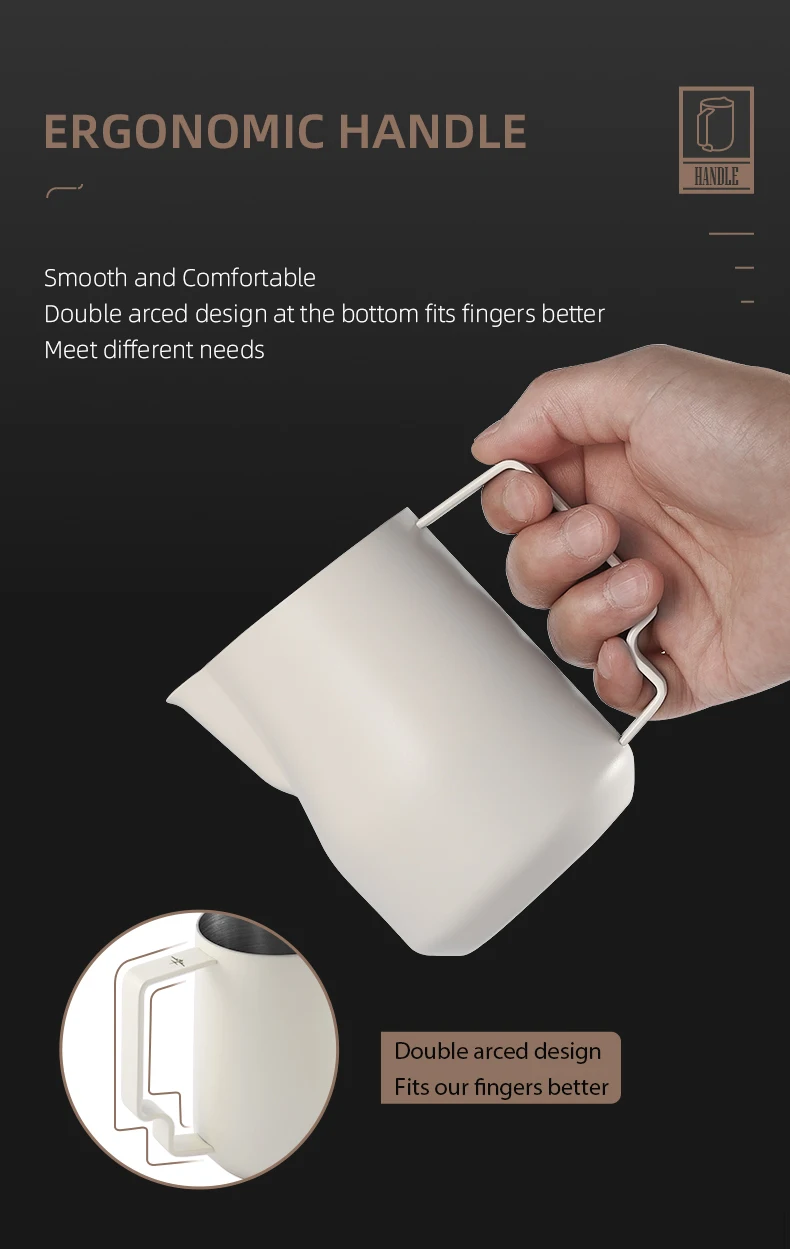 The unique double-arc handle fits naturally in your hand and supports multiple grip styles. Enjoy stable, comfortable, and precise control whether you’re frothing milk or pouring detailed latte art patterns.